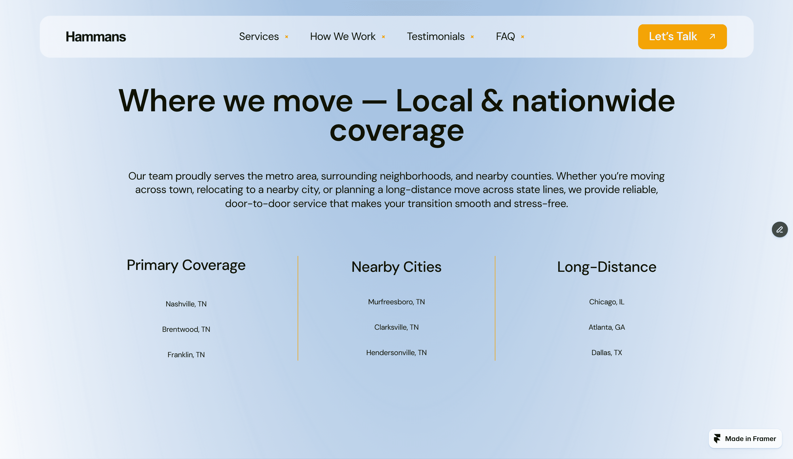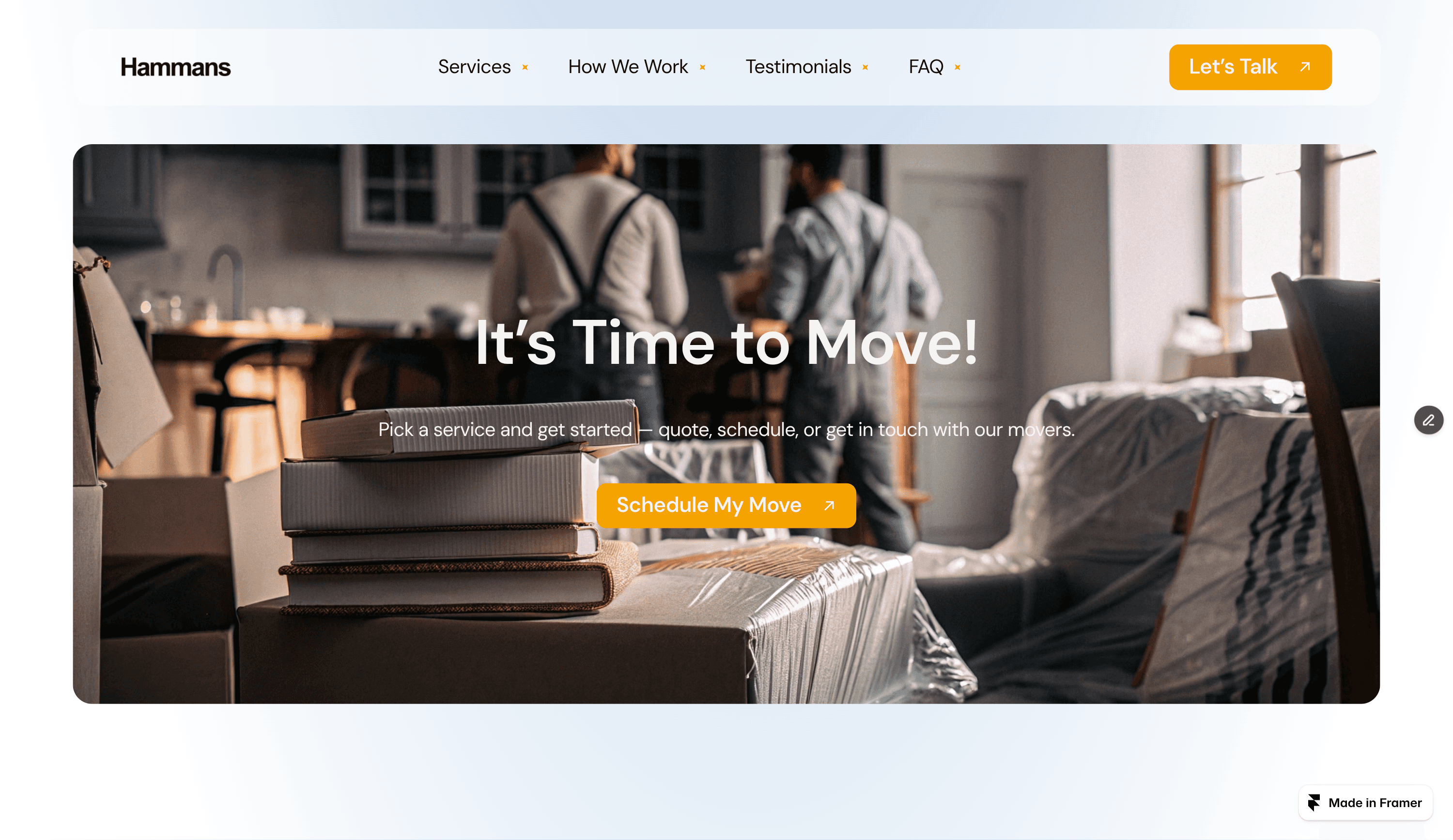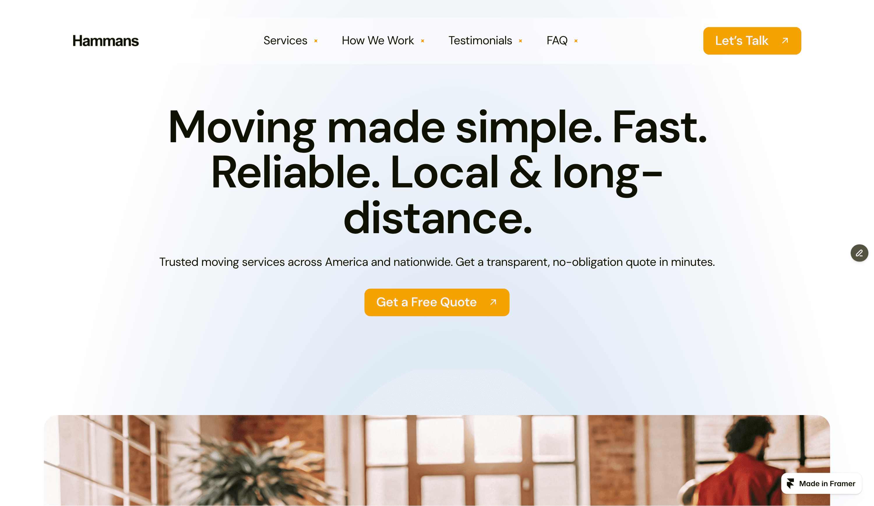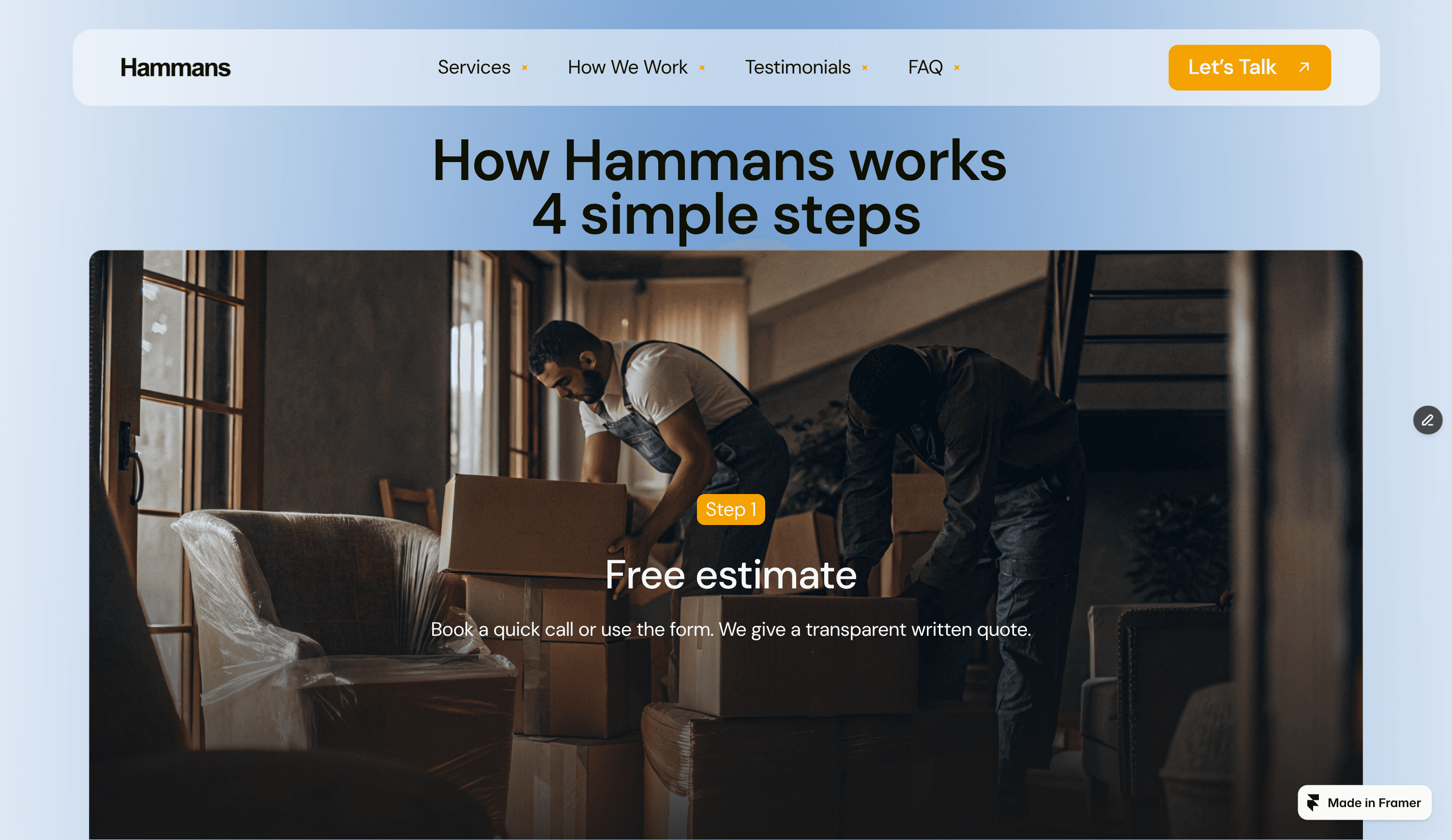 Hammans is a modern Framer microsite built for moving companies, relocation services, and logistics businesses.